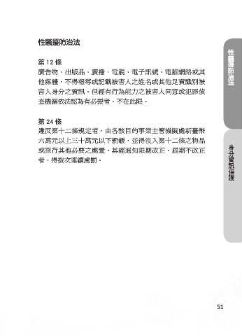 性騷擾防治法 性騷擾防治法 第12條 廣告物、出版品、廣播、電視、電子訊號、電腦網路或其 他媒體,不得報導或記載被害人之姓名或其他足資識別被 害人身分之資訊。但經有行為能力之被害人同意或犯罪偵 查機關依法認為有必要者,不在此限。 第24條 身分資訊保護 違反第十二條規定者,由各該目的事業主管機關處新臺幣 六萬元以上三十萬元以下罰鍰,並得沒入第十二條之物品 或採行其他必要之處置。其經通知限期改正,屆期不改正 者,得按次連續處罰。 51